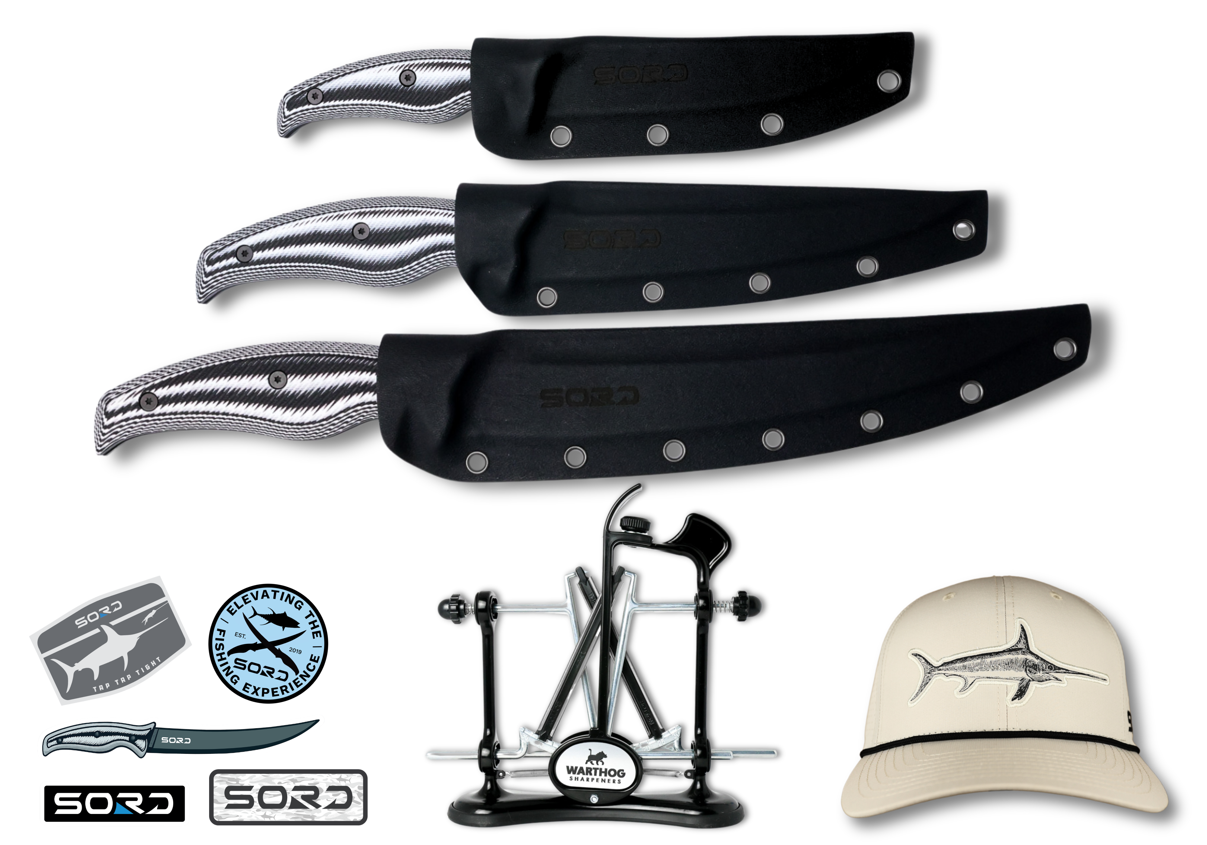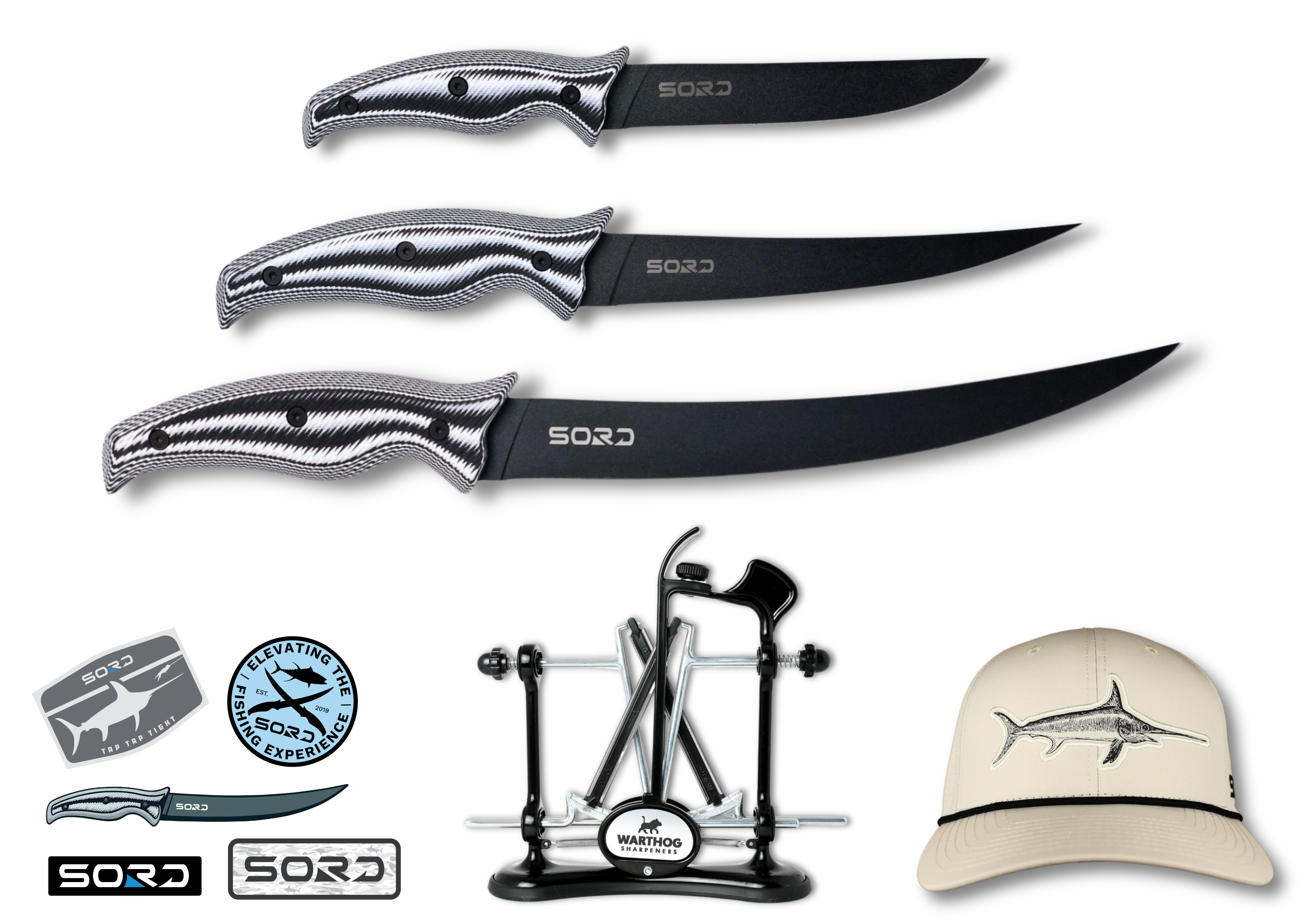 This fully loaded kit includes 2 of our best selling fillet knives, our tank of a 5" utility knife for all things deck work, and a Warthog A4 Knife Sharpener to maintain all your blades, even kitchen knives. PLUS you'll get the brand new SORD Sticker Pack and the limited edition Swordfish Holiday Hat. This is for the crazy ones who rep SORD because they live to be where the map turns blue.