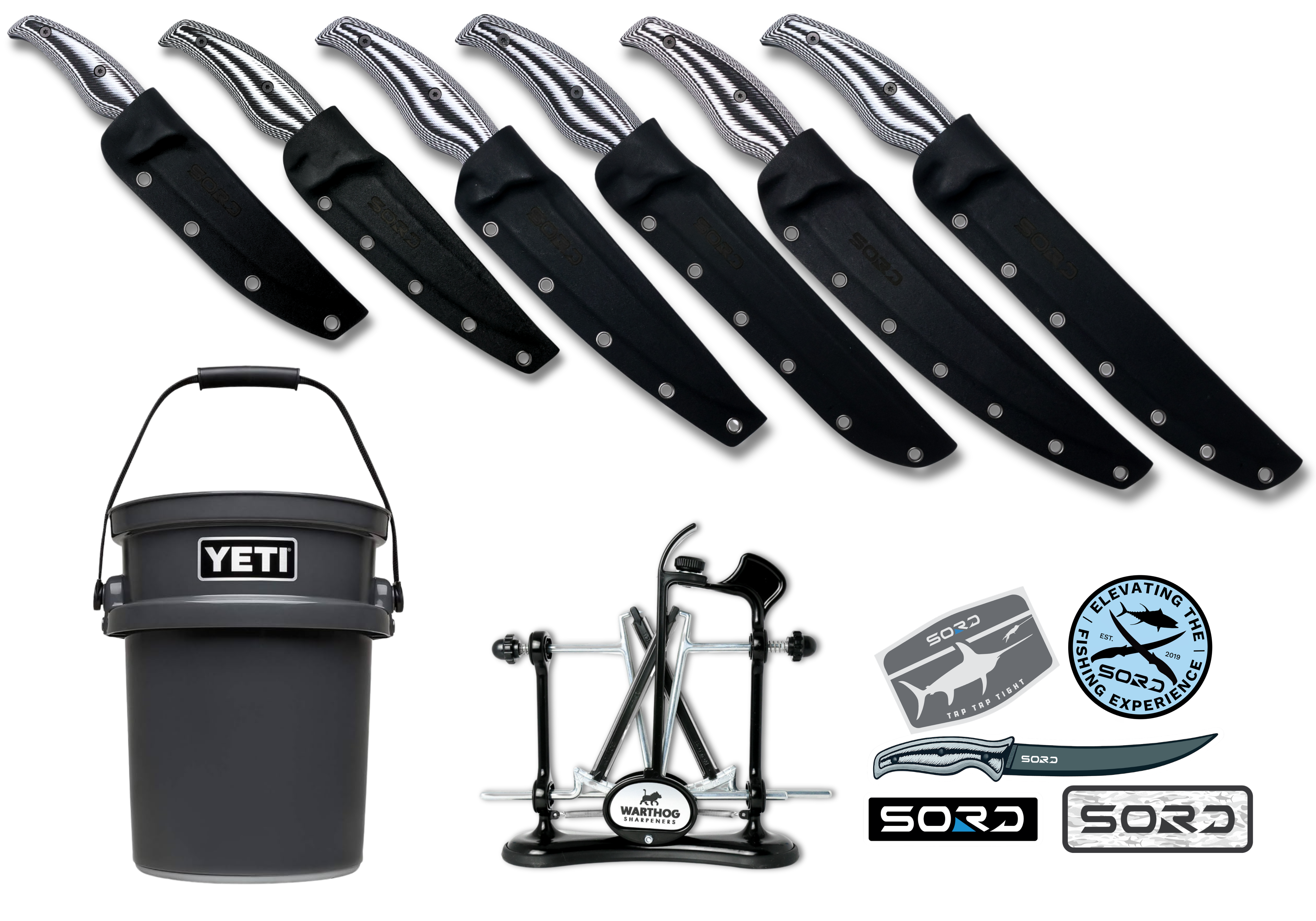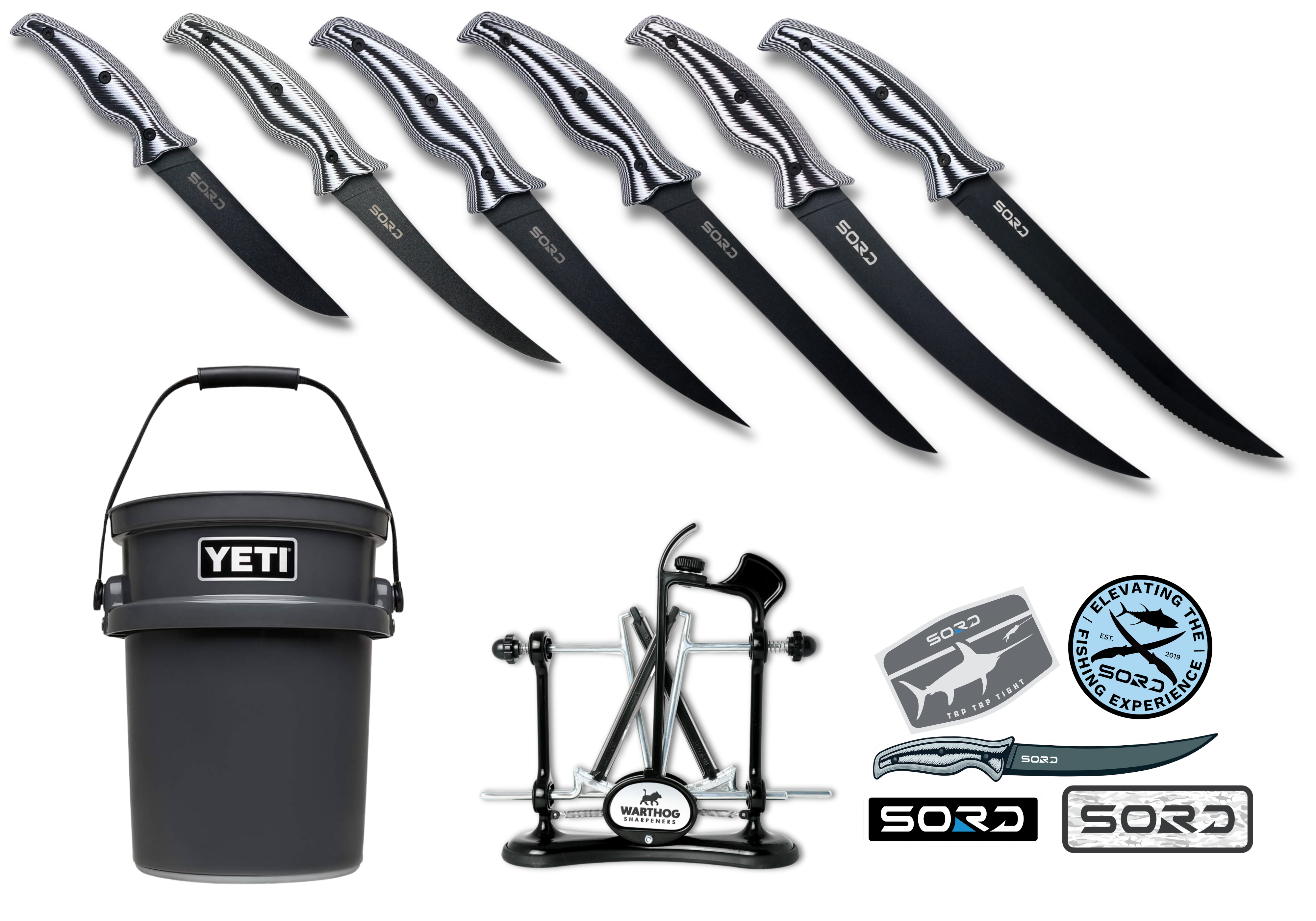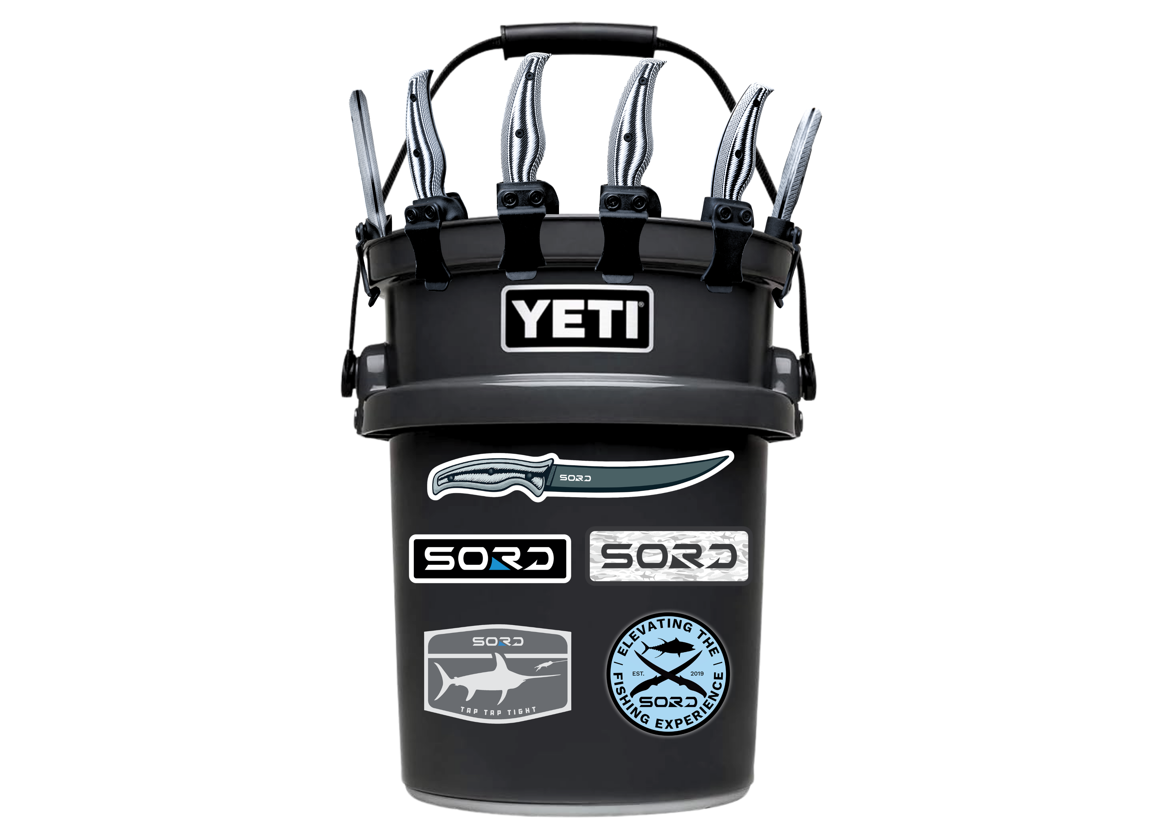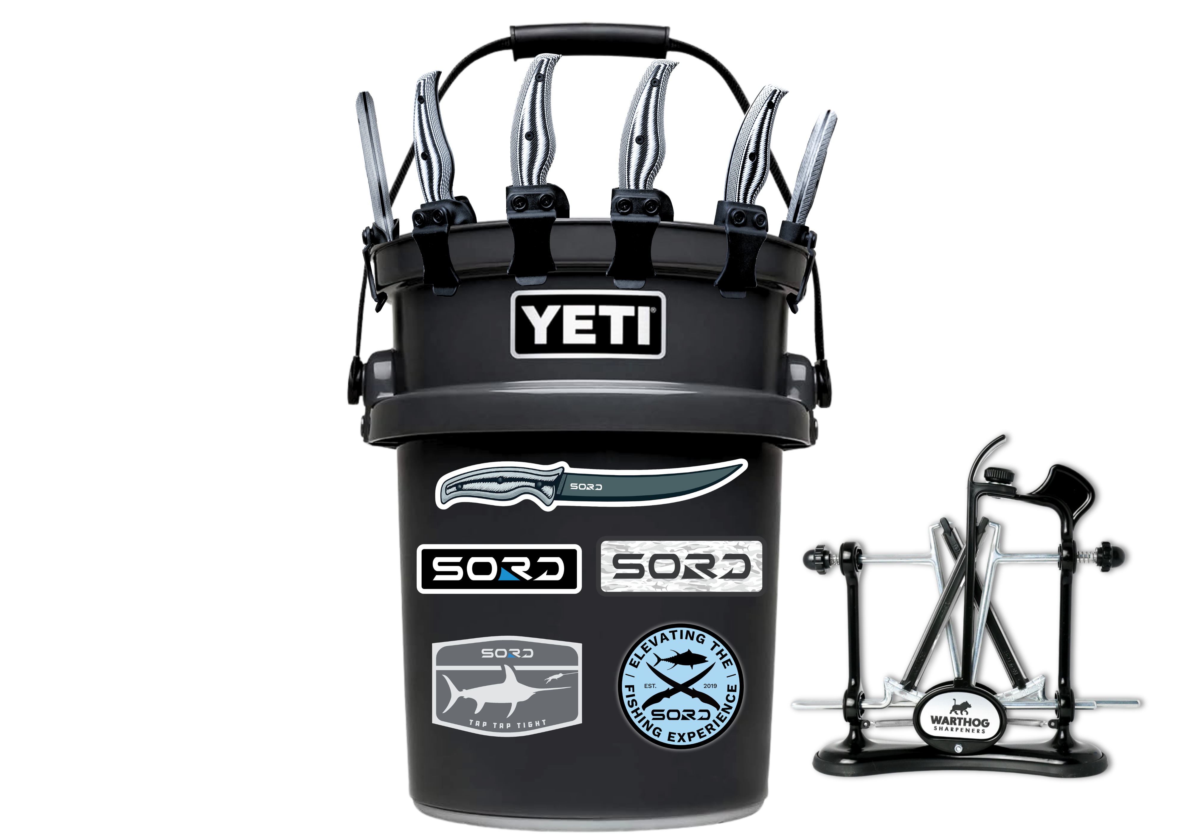 The SORD x YETI Boat Outfit Bucket is a fully loaded fish-cleaning system including 6 of our best selling fillet knives, our tank of a 5" Utility Knife, a Warthog A4 Knife Sharpener to maintain your blades, and it's all built for rugged transport with the pre-stickered SORD x YETI LoadOut Bucket. Forget about spring prep, it's time to dominate the fish-cleaning table for years to come.
